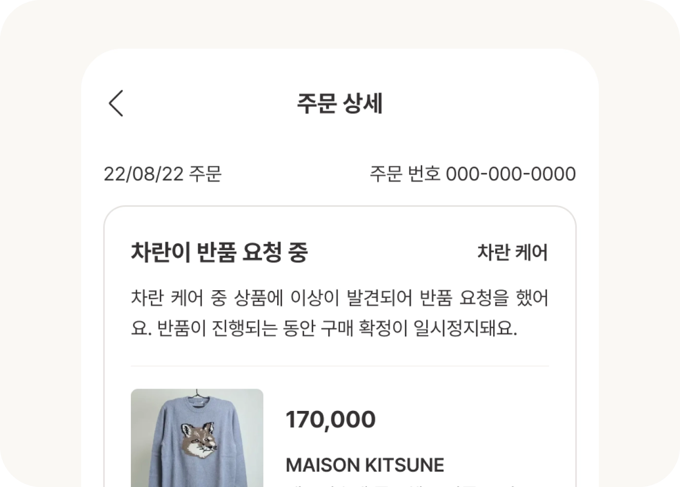 차란케어/프리미엄 차란케어 상품은 검수 과정에서 상품 설명에 표시되지 않은 오염·하자가 확인되면, 차란이 반품을 요청할 수 있어요. 이 경우 판매자가 승인/거절을 선택할 수 없어요.